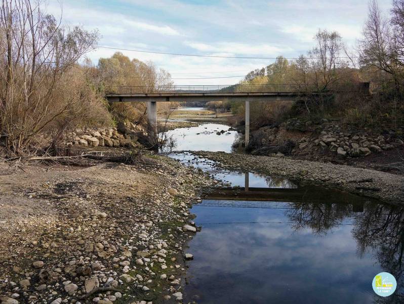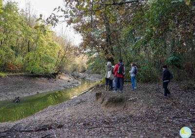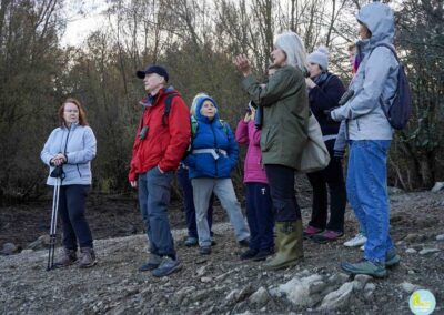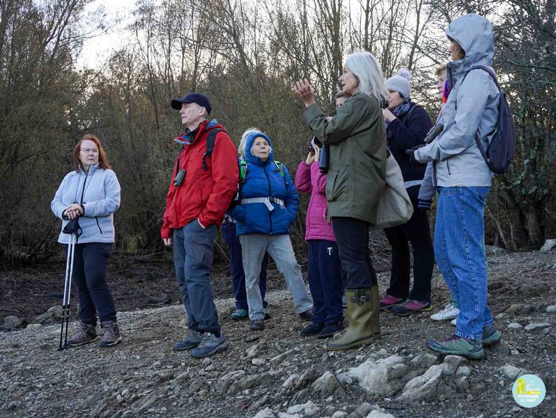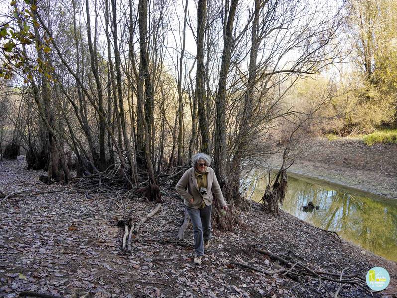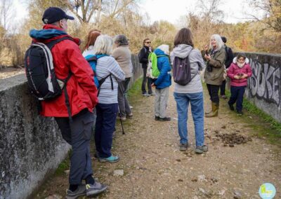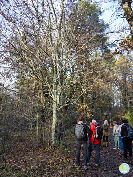 Nous suivons Marjorie à travers un étroit chemin embroussaillé. Le temps est clément en ce début d’après-midi, un vrai temps d’automne. Le pâle soleil de décembre peine à colorer les feuilles multicolores des aubépines, des cornouillers, des troènes et des paliures qui nous environnent ; le chemin débouche sur l’ancien pont qui traverse le Biançon. Petite pause. De là, nous avons un très beau panorama sur le lac vers l’est et sur le Biançon à l’opposé. De là, un maigre filet d’eau coule encore en direction du lac. Des saules argentés en grande quantité bordent les rives du Biançon, et des hauts peupliers noirs dépouillés de leurs feuilles, dominent saules et frênes et la rivière de leur hauteur majestueuse. On ne voit qu’eux. « Regardez, c’est comme un grand peigne » nous lance la guide. Sur la plus haute branche d‘un des arbres, trône une grosse boule brunâtre, visible de loin. Claude reconnait un nid de Frelon à pattes jaunes (mal nommé « frelon asiatique »). Marjorie confirme. Elle embraye, « regardez les roches qui surplombent la rivière, entre les strates, il y a des cavités avec des chauves-souris et les martins pêcheurs s’observent facilement depuis ce pont ».