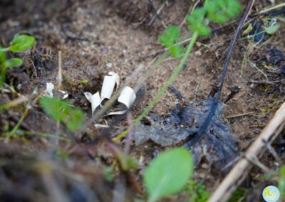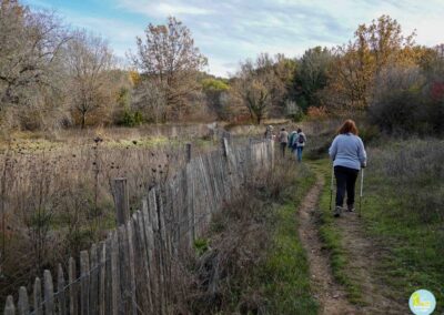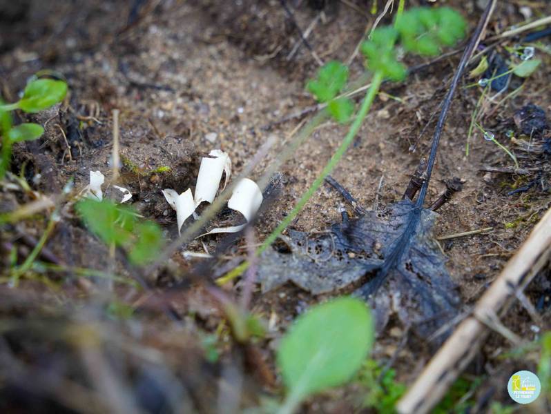 La marche reprend. Nous abordons un espace à la croisée des chemins, au milieu, un triangle enherbé. Marjorie nous pose une question : « Regardez attentivement ce triangle d’herbes, il y a quelque chose de remarquable ». Tout le monde s’échine à regarder sans rien voir. La plus jeune du groupe, A. voit ce qu’il faut voir. « Là, c’est blanc ! » dit-elle en désignant des petits serpentins blancs dans les herbes bordant le chemin. « Oui, c’est ça » ajoute Marjorie. Ce sont des coquilles d’œuf de tortues d’Hermann qui ont éclos au mois de septembre dernier et de nous en montrer ailleurs encore.
