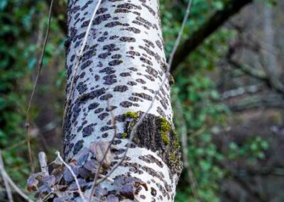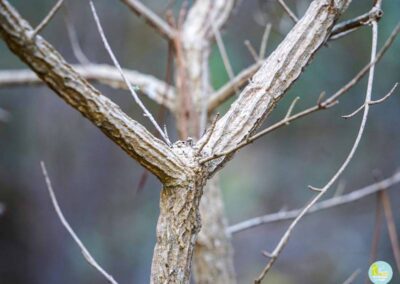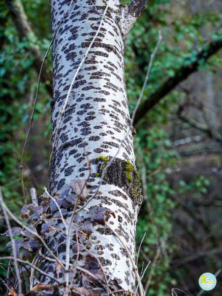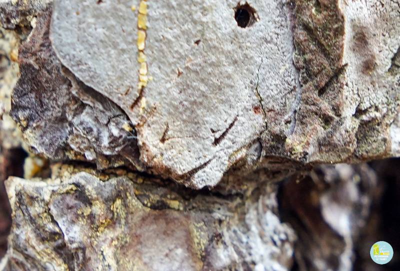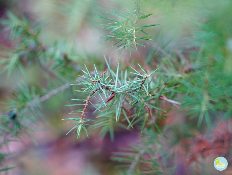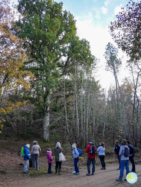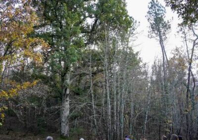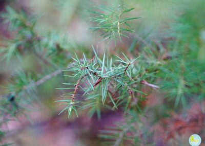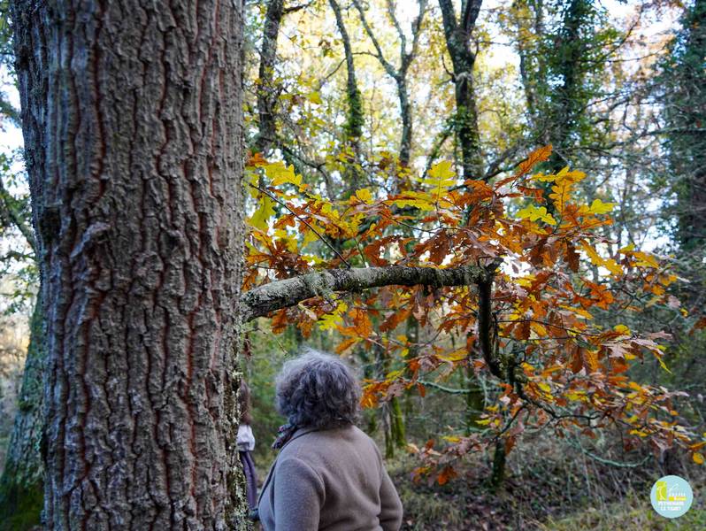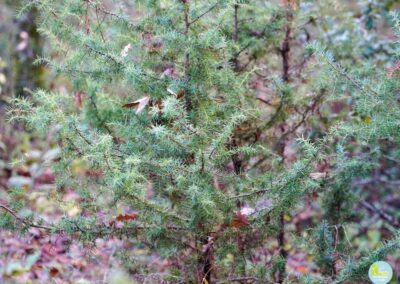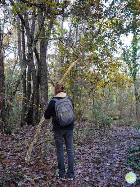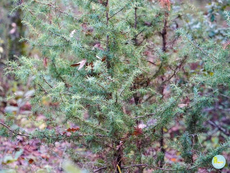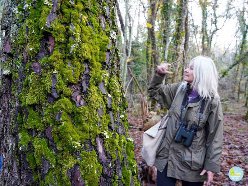Au détour d’un chemin, nous rentrons dans la zone la plus froide du site. Et là, le lichen recouvre entièrement certains troncs, blanc, chevelu, doux. Autour de nous, les cades laissent la place aux genévriers communs, aux noisetiers et aux charmes. Qui dit biotope plus froid, dit flore de moyenne montagne.