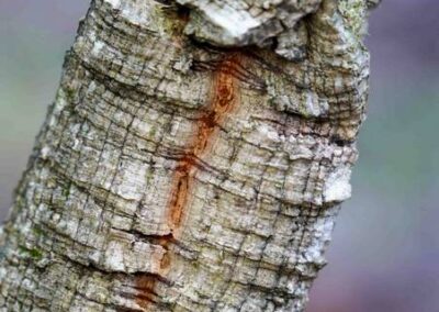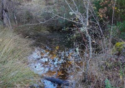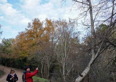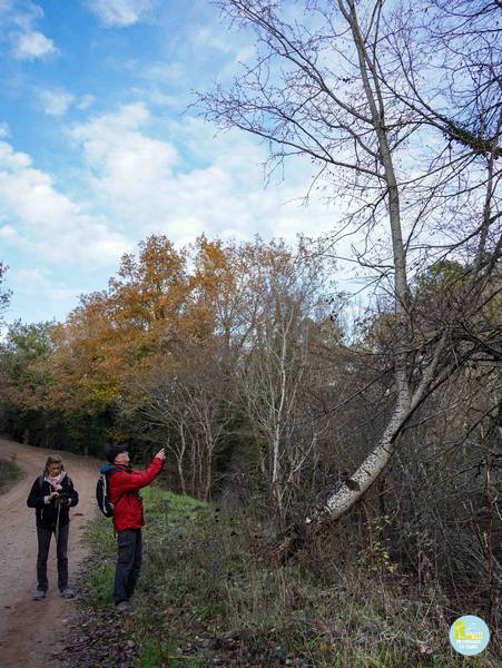 « Ici, nous explique Marjorie, les cailloux blancs que vous voyez sur la rive opposée, ce sont des restes de l’aqueduc romain qui conduisait l’eau de Mons à Fréjus. Il traversait une partie des vallées ». Derrière-nous arrive un couple, appareil photo et longue focale en bandoulière. Il diverge vers la zone très fragile de la saulaie située juste à notre gauche. Il s’apprête visiblement à mitrailler la faune du coin. Nous, nous respectons les lieux et nous contournons soigneusement cette zone pour éviter le piétinement. Le sentier devient étroit et une barrière nous interdit de continuer. Nous bifurquons à droite, grimpons le sentier qui traverse une zone peuplée de pins maritimes presque tous malades. Un petit arrêt au pied d’un de ses représentants pour regarder les griffures des écureuils laissées sur leurs troncs. Marjorie traque les animaux, petits triangles, petites coches pour ces derniers, mais les fouines, elles, plus lourdes, font des dérapages contrôlés sur les troncs, et laissent de longues trainées, marques de leur passage.
