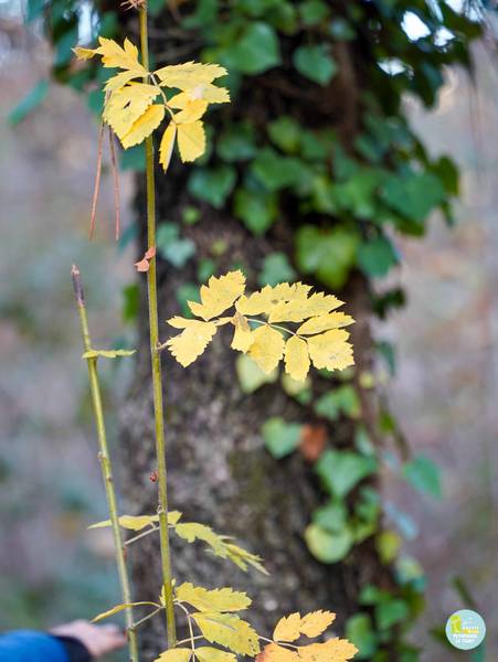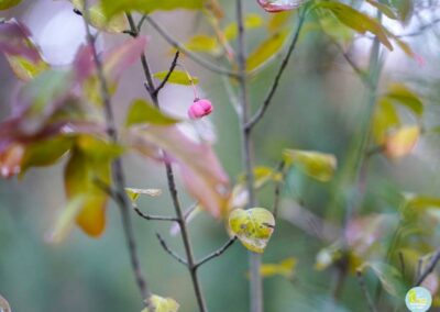 La balade touche à sa fin, nous rencontrons encore le fusain d’Europe. Leurs feuillages se bariolent de toutes sortes de couleurs chaudes de l’automne et entre les branches, nous voyons perler leurs fruits roses et orangés si typiques…. et « Très toxiques », prévient notre guide.